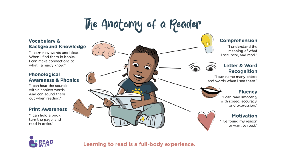 That’s the idea behind Read by 4th’s Anatomy of a Reader, a simple, visual tool that shows families, community members, and partners what actually goes into learning to read, and why every piece matters.